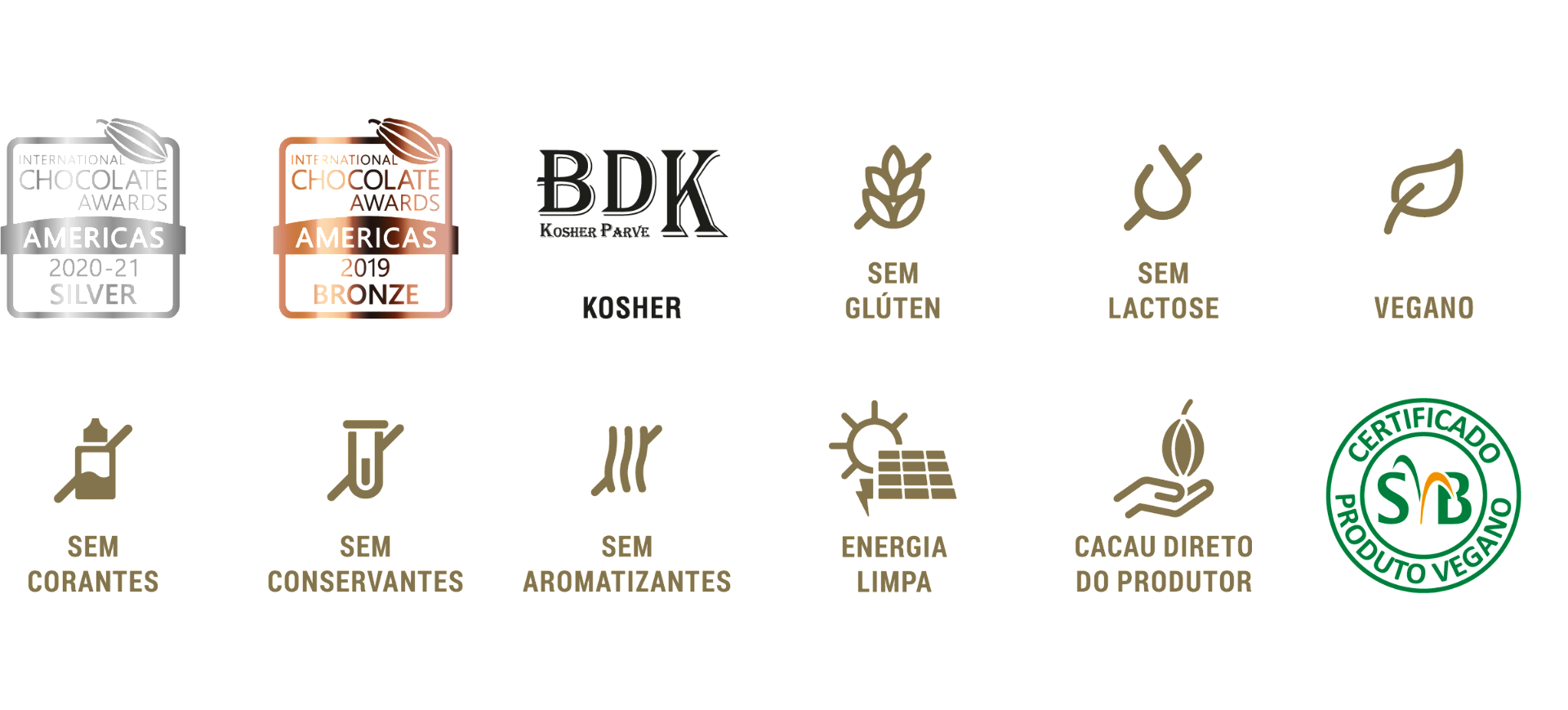 Alto teor de cacau, naturalmente adocicado, rico em sabores e aromas frutados. Possui notas de banana, cítricas e outras frutas tropicais. Plantados em sistema agroflorestal, à sombra de árvores centenárias, preservando a floresta nativa. Sem glúten, sem lactose, sem soja e livre de gorduras trans. Sem conservantes, corantes ou aromatizantes artificiais.